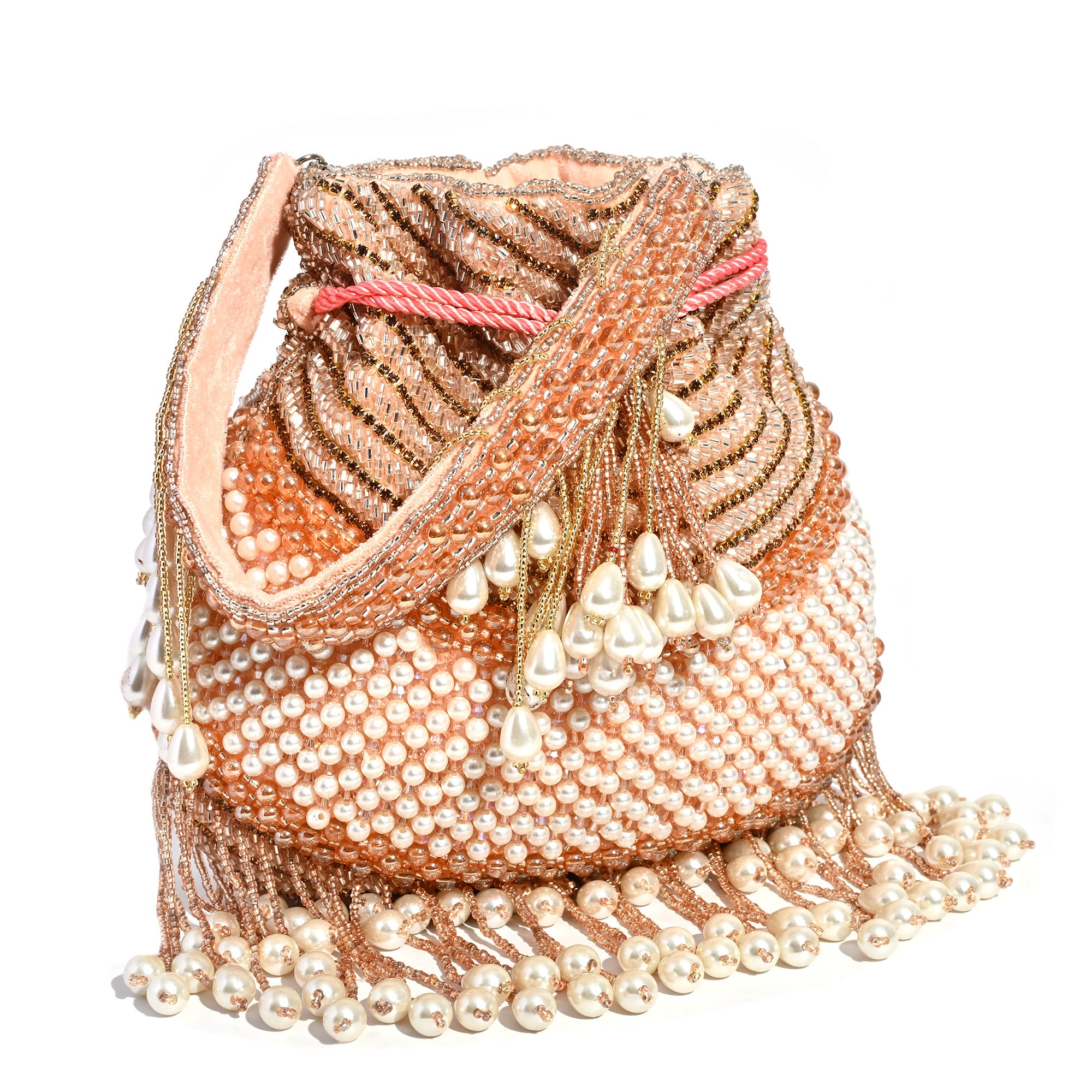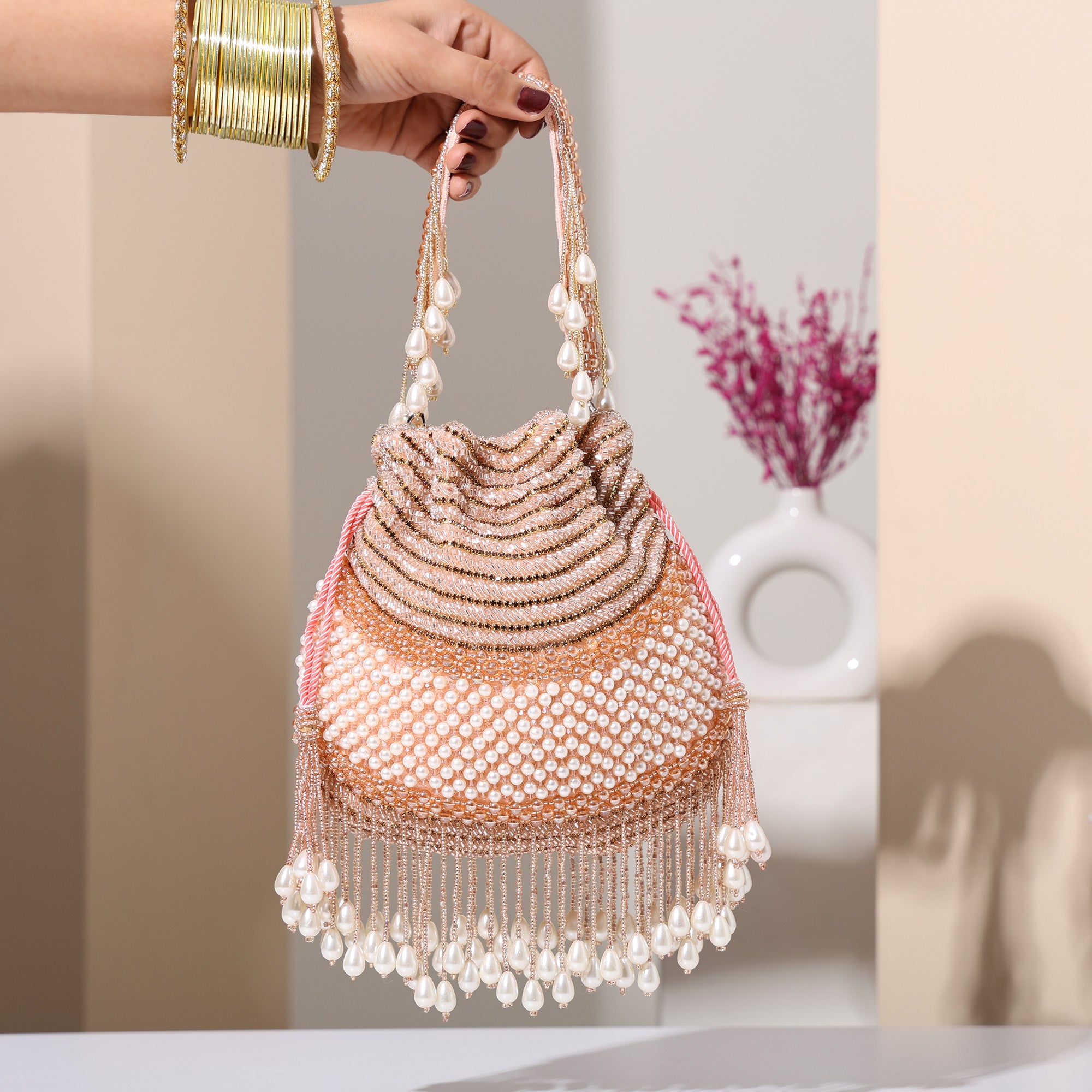 Inaaya Potli is handcrafted on a luxurious peach silk base and intricately hand embroidered with peach-colored cutdana, pearls, glass beads, and delicate micro beads. Every detail is a testament to the skill and dedication of Bharat’s artisans.