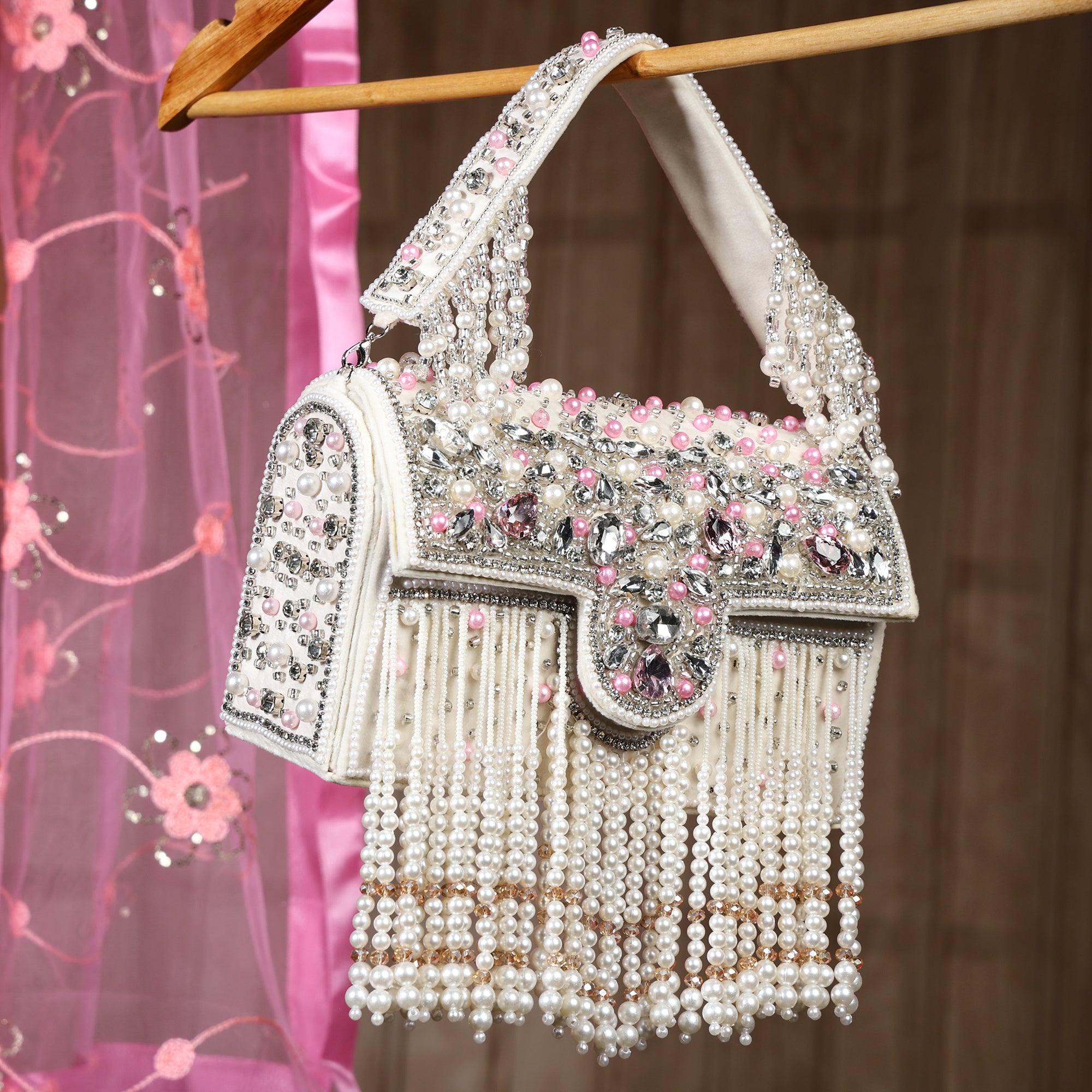 Introducing the Mira White Box Clutch — a striking fusion of classic elegance and modern detail. This structured box clutch features a luxe suede base adorned with hand-applied stones and pearls, finished with graceful pearl tassels that sway delicately with every movement.