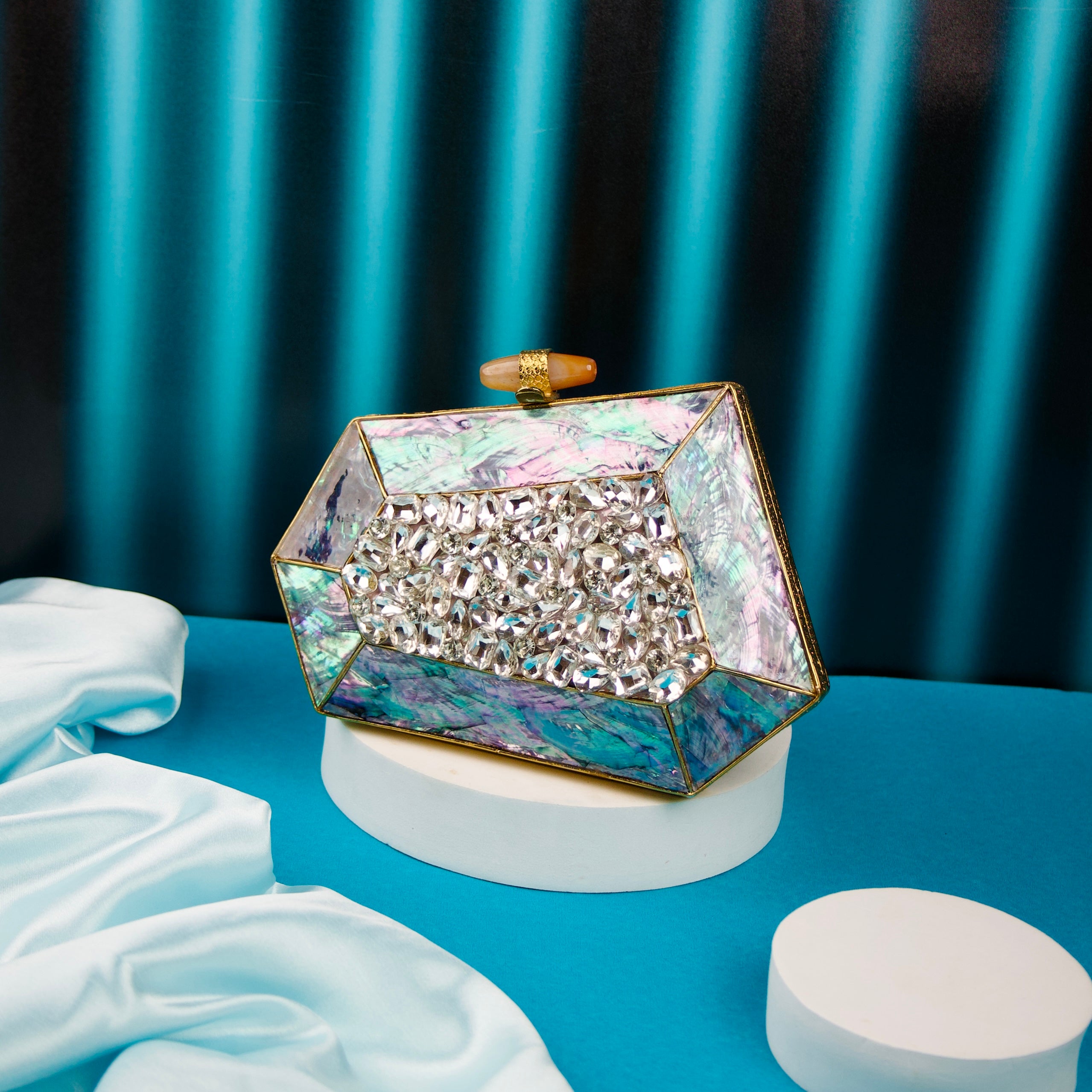 Introducing the Neelam MOP Clutch, a statement piece crafted with elegance and artisanal detail. The front showcases a shimmering blue Mother-of-Pearl sheet, accented with hand-placed stones that add luxury and sparkle.