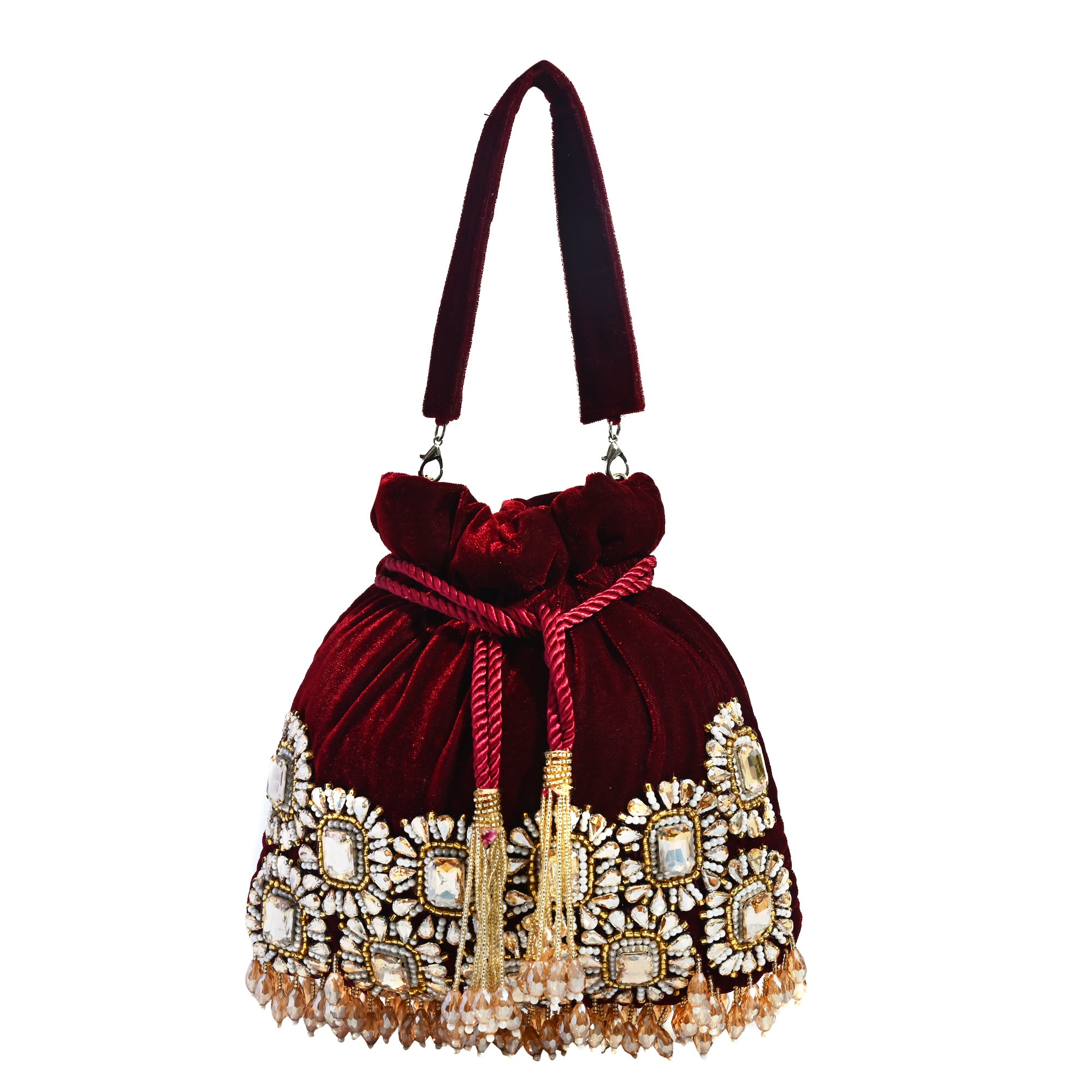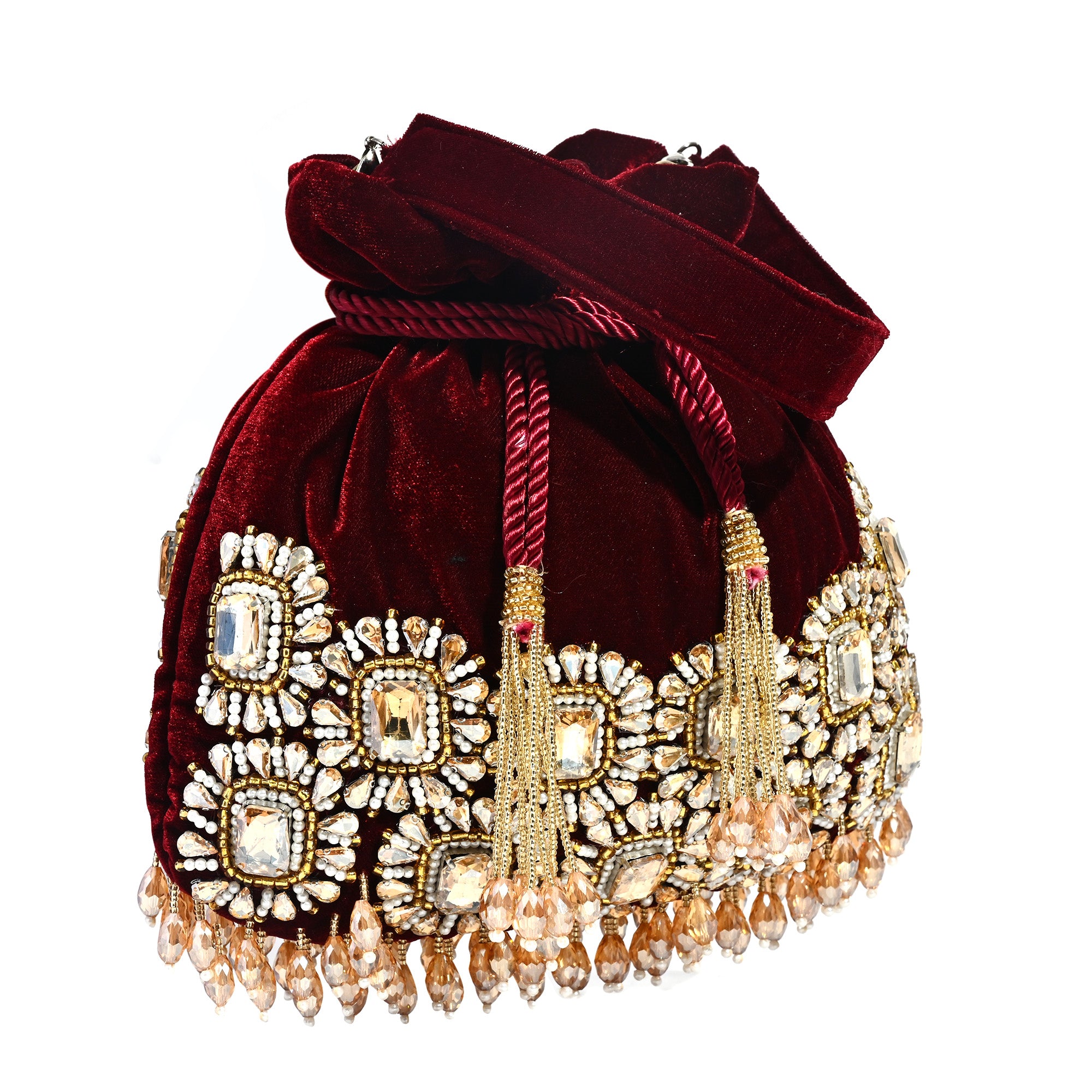 Add traditional elegance to your look with this handcrafted Noori Potli Bag in a rich mehroon shade. Embellished with delicate golden stones, this bag is designed to shine at weddings, festivals, and special occasions.