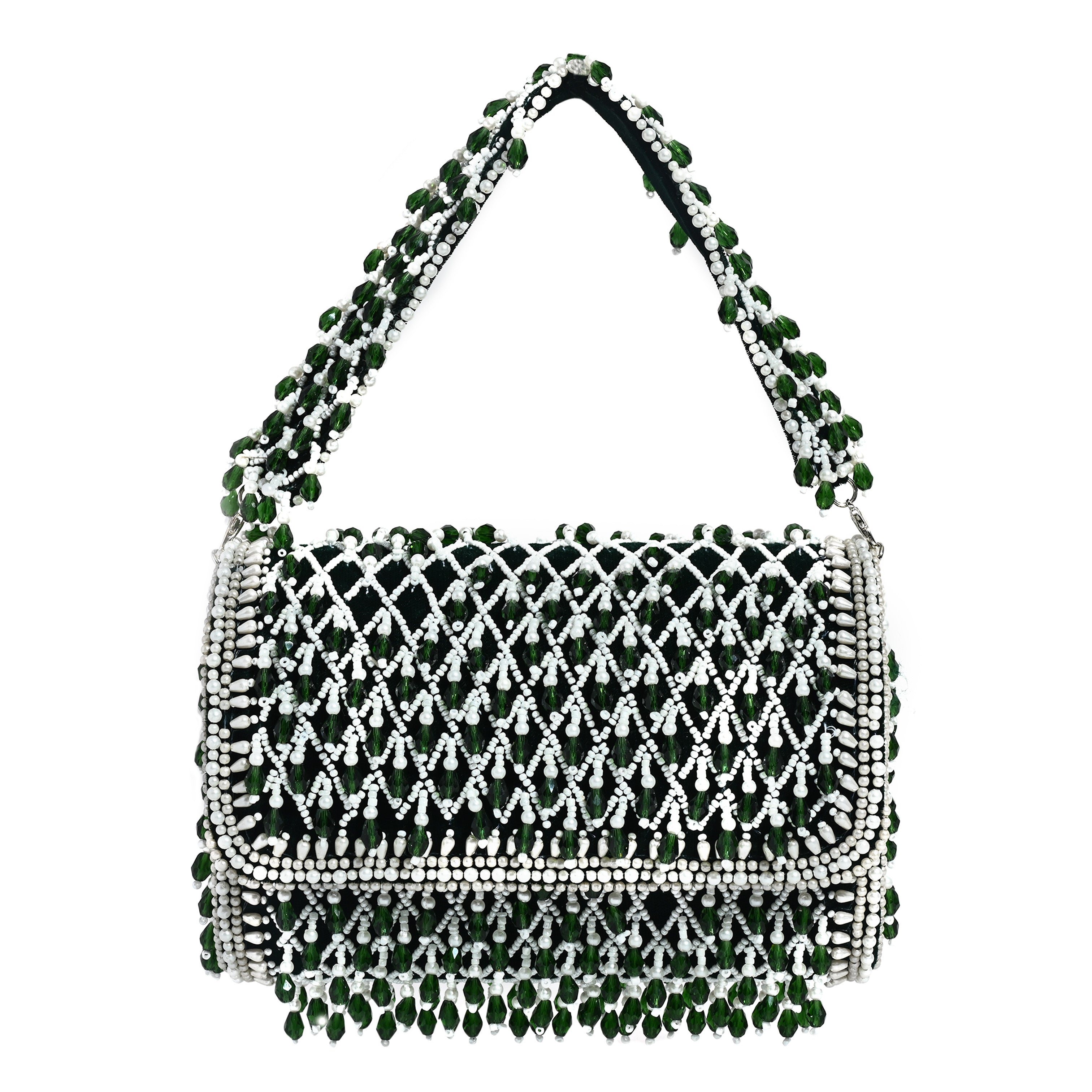 Add regal charm to your look with the Panna Flap Bag by House of Webhin. Crafted from deep green velvet, this handcrafted bag features exquisite green crystal beads and white pearl work all over, making it a statement accessory for festive and wedding occasions.