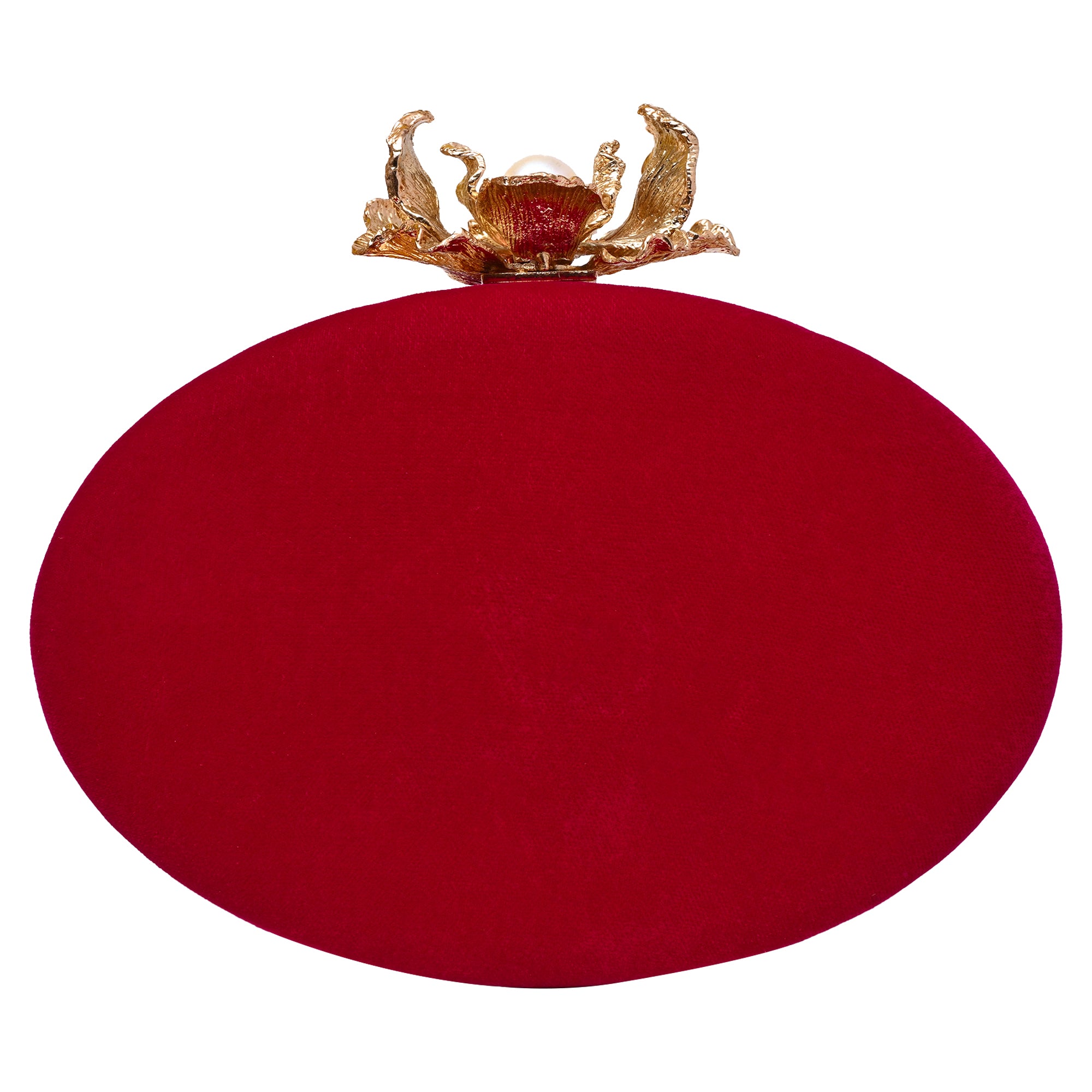 Handcrafted in rich red velvet with an elegant oval silhouette, this clutch features a striking flower knob clasp closure. Personalise it with your name, initials, or a memorable date, making it the perfect keepsake for weddings, parties, or gifting.