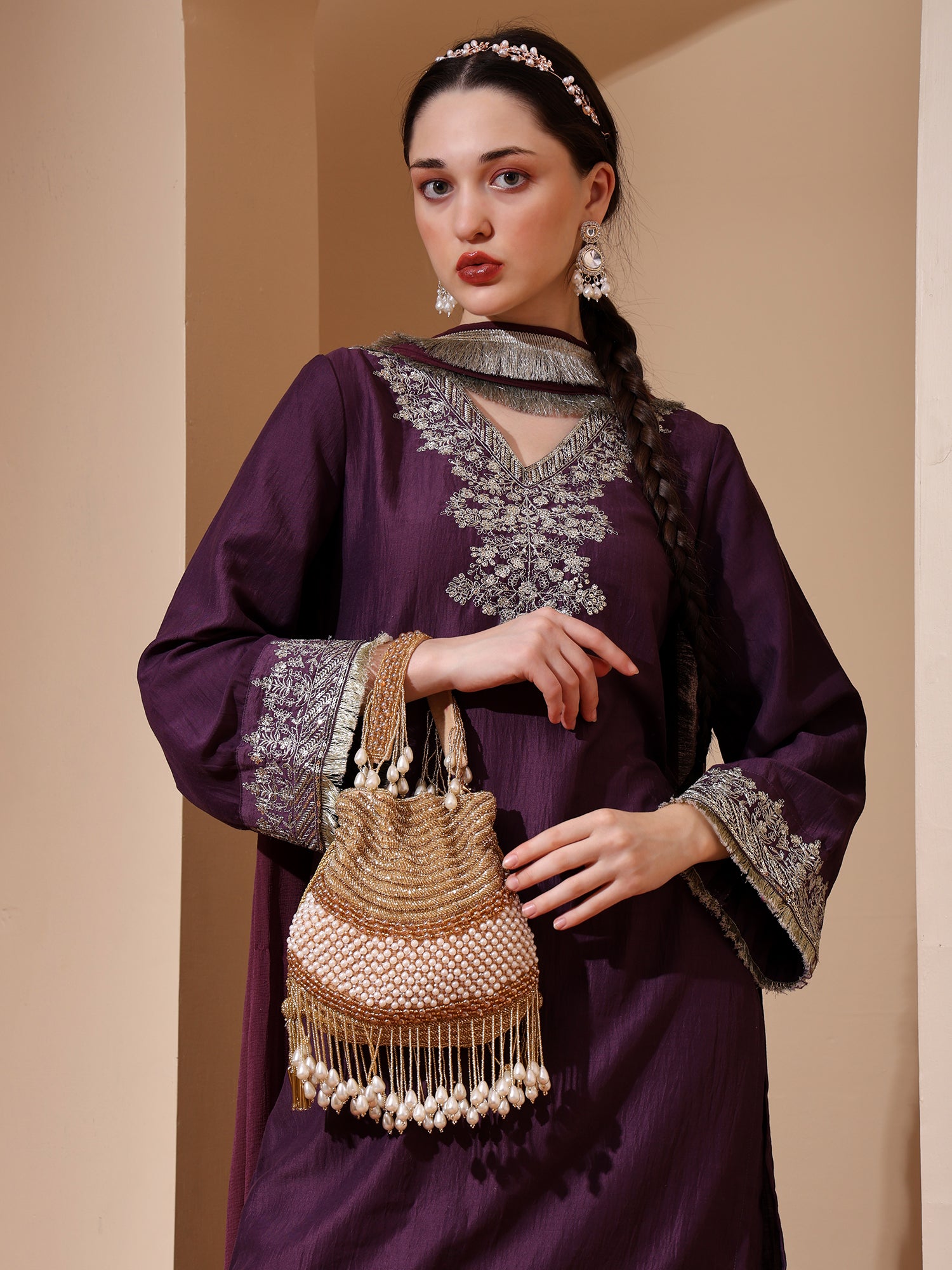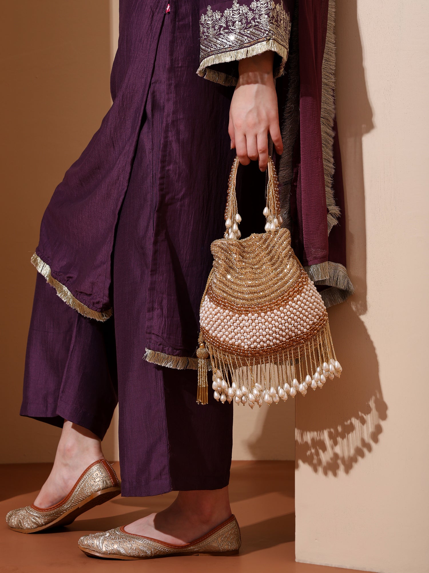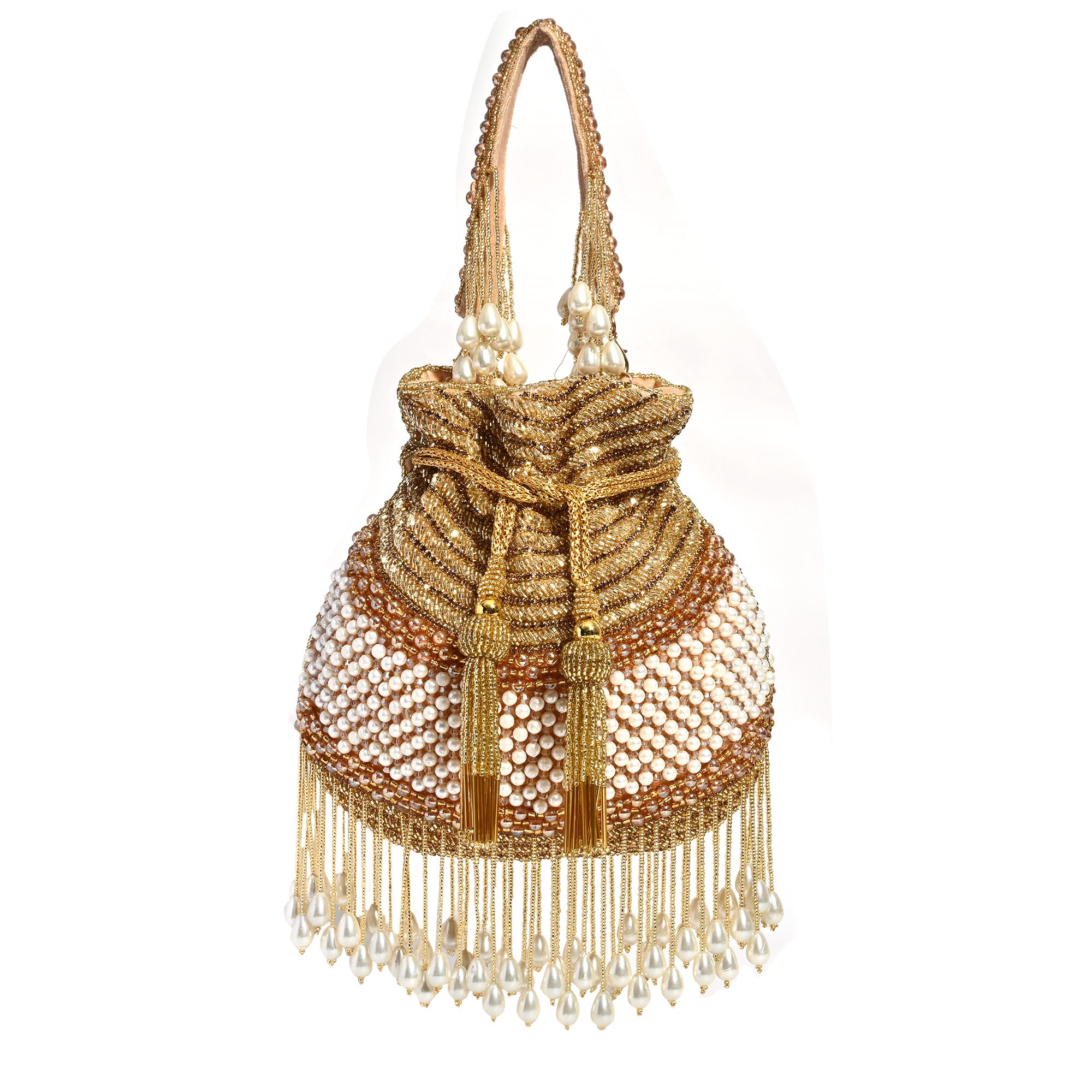 The embroidered handle adds elevated detailing, while playful tassels at the bottom create graceful movement with every step. Finished with a secure drawstring closure, this potli blends functionality with statement elegance.