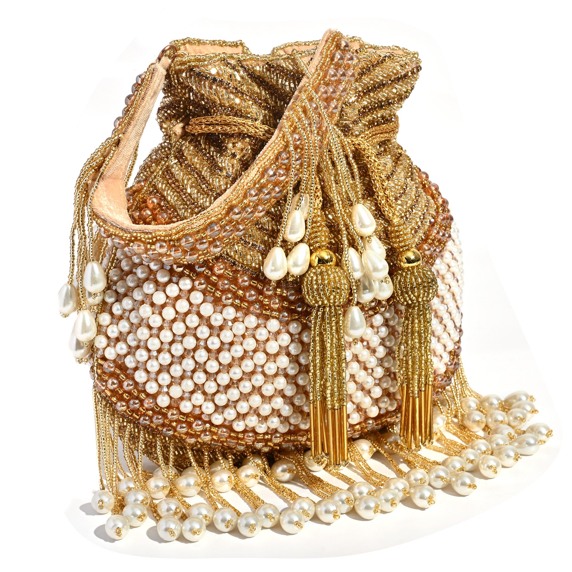 Zarmina Potli is handcrafted on a rich golden base and intricately adorned with cutdana, pearls, glass beads, and delicate golden micro beads — each element hand embroidered by skilled artisans of Bharat.