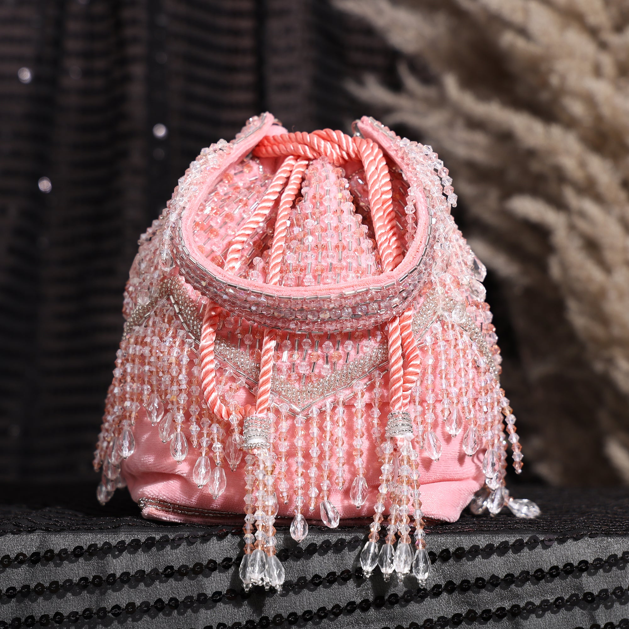 Designed with a short embroidered handle and drawstring closure, this potli combines traditional craftsmanship with modern elegance. Spacious enough to carry your essentials, it’s the perfect accessory for weddings, parties, and festive occasions.