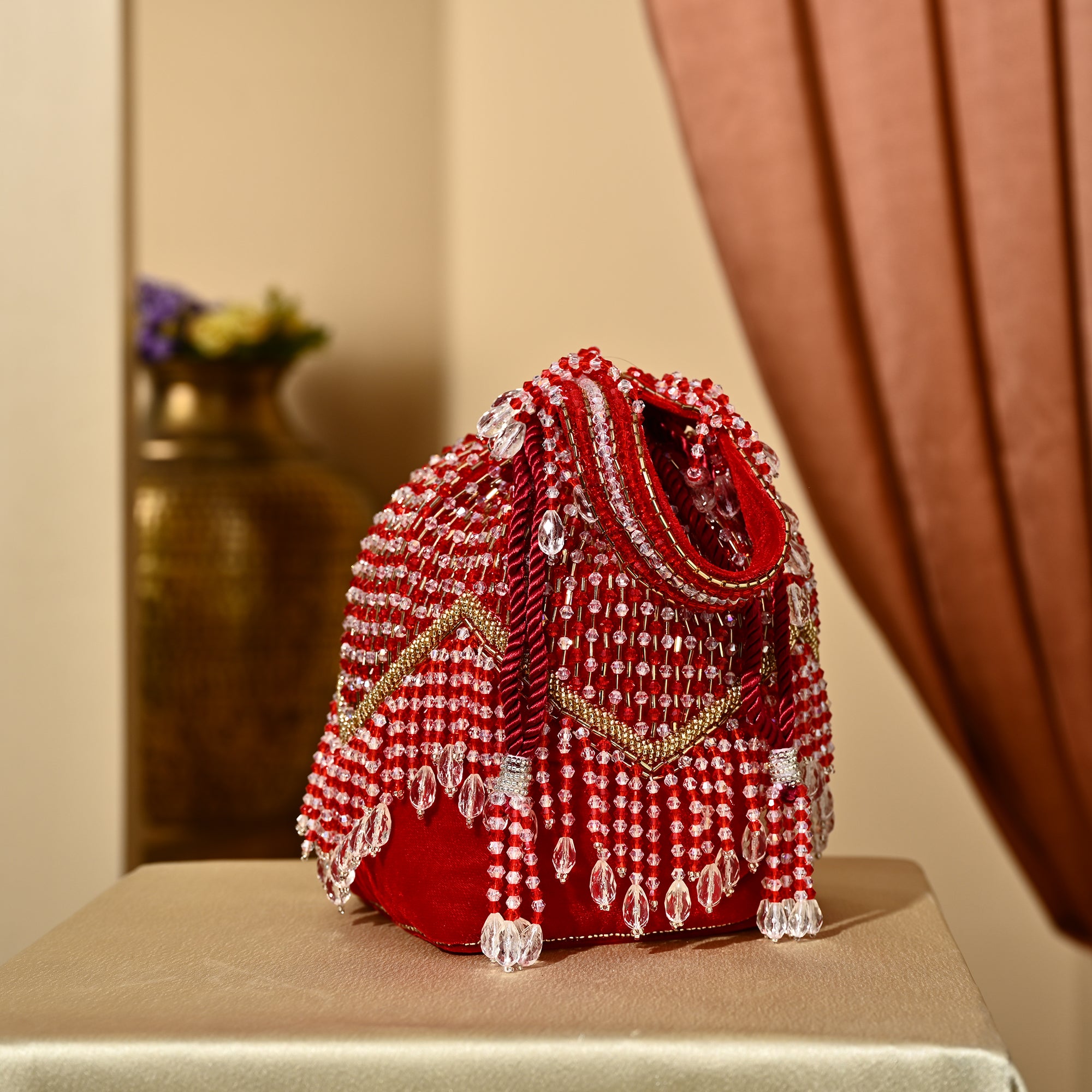 Elevate your festive and wedding looks with our Red Velvet Bucket Potli Bag from House of Webhin. Handcrafted in Bharat, this luxurious potli features intricate silver and red glass beadwork on rich velvet fabric, adding a regal charm to any outfit.