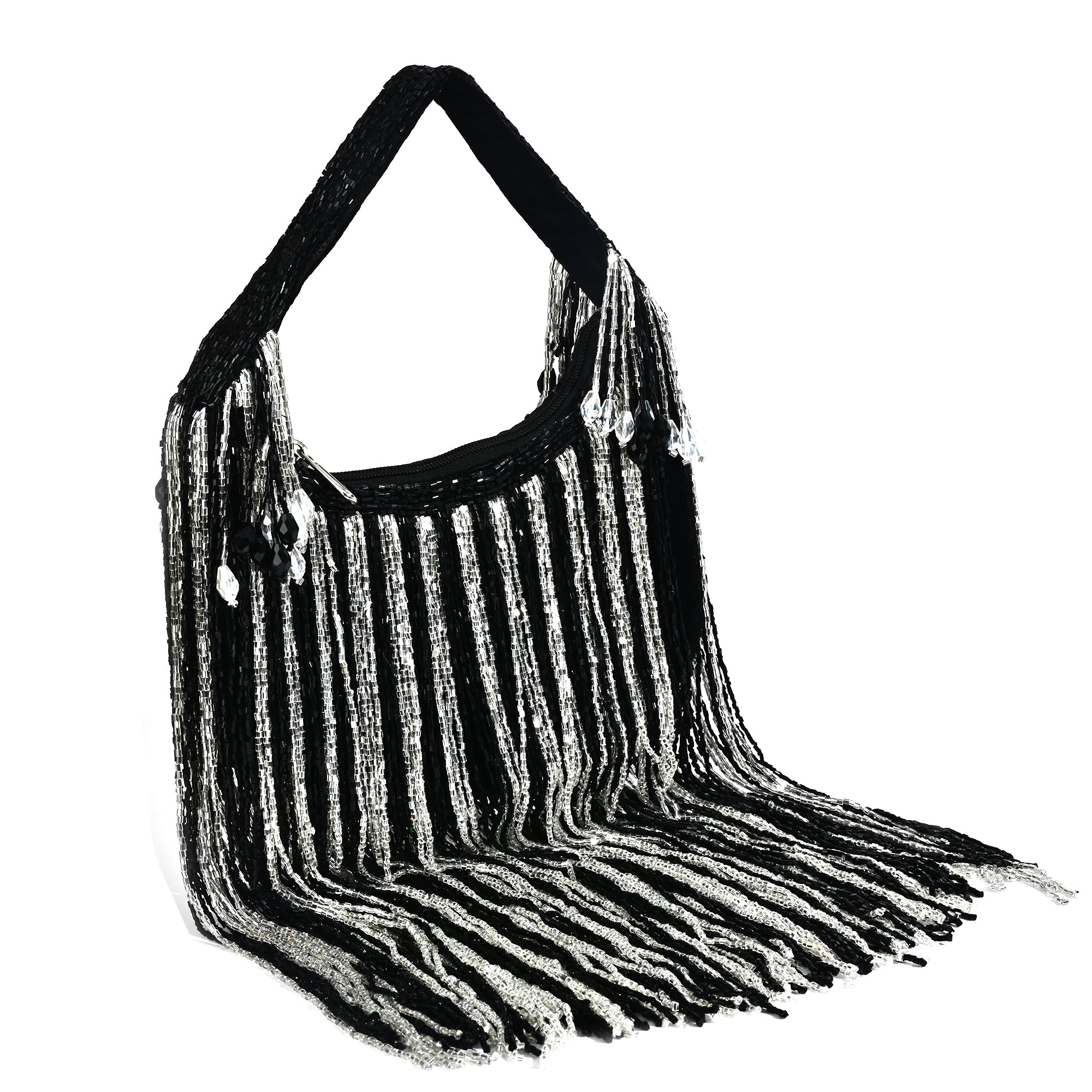 The Ziya Black Tassel Clutch is where elegance meets drama. Handcrafted with black and silver cutdana embroidery, this clutch sparkles under the light, making it a perfect statement piece for evening occasions. The design is elevated with long flowing tassels that add movement and charm, while the attached handle ensures ease of carrying.